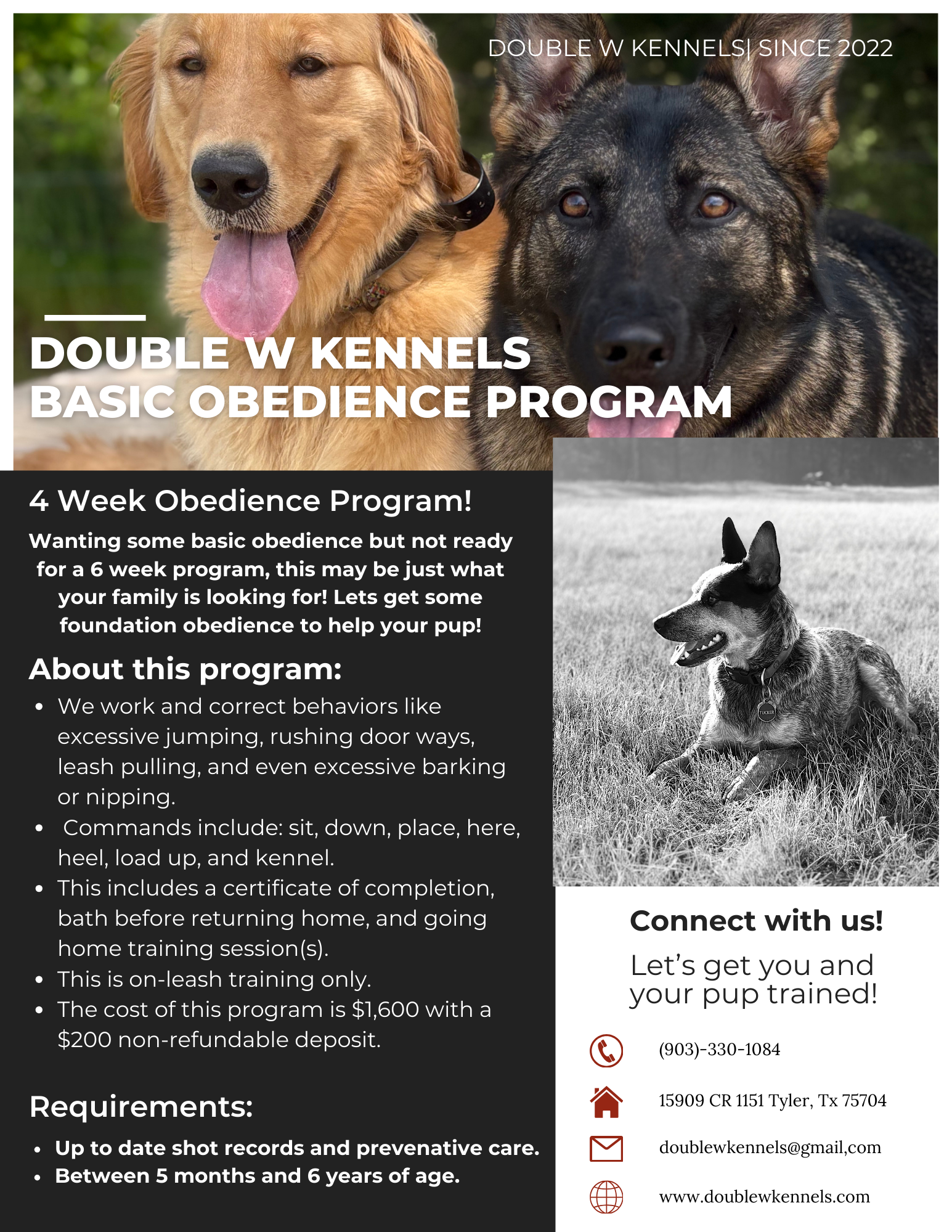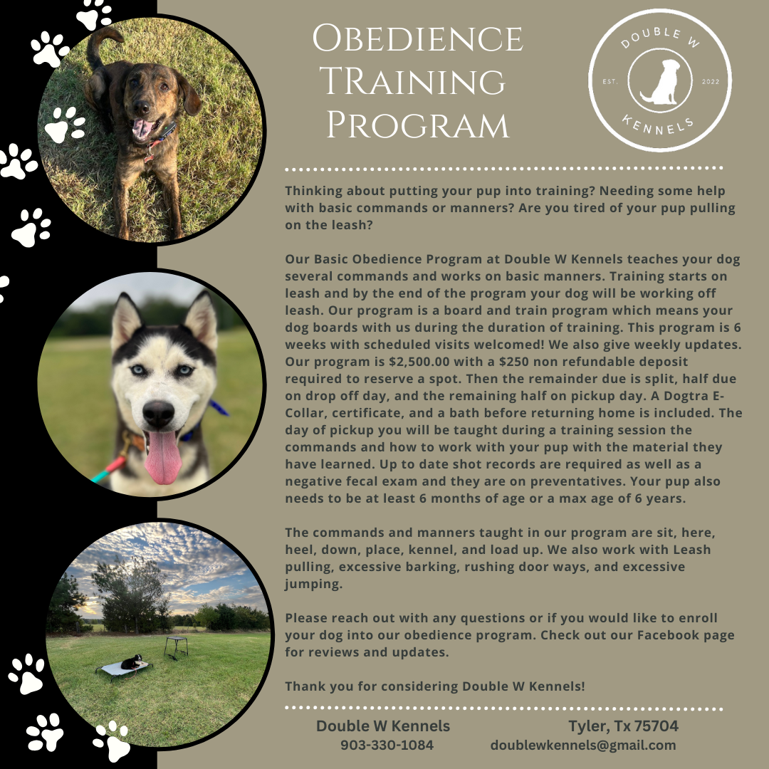 This program is 6 weeks and is the most popular training program as we have more time to work with your pup and complete off leash training as well.