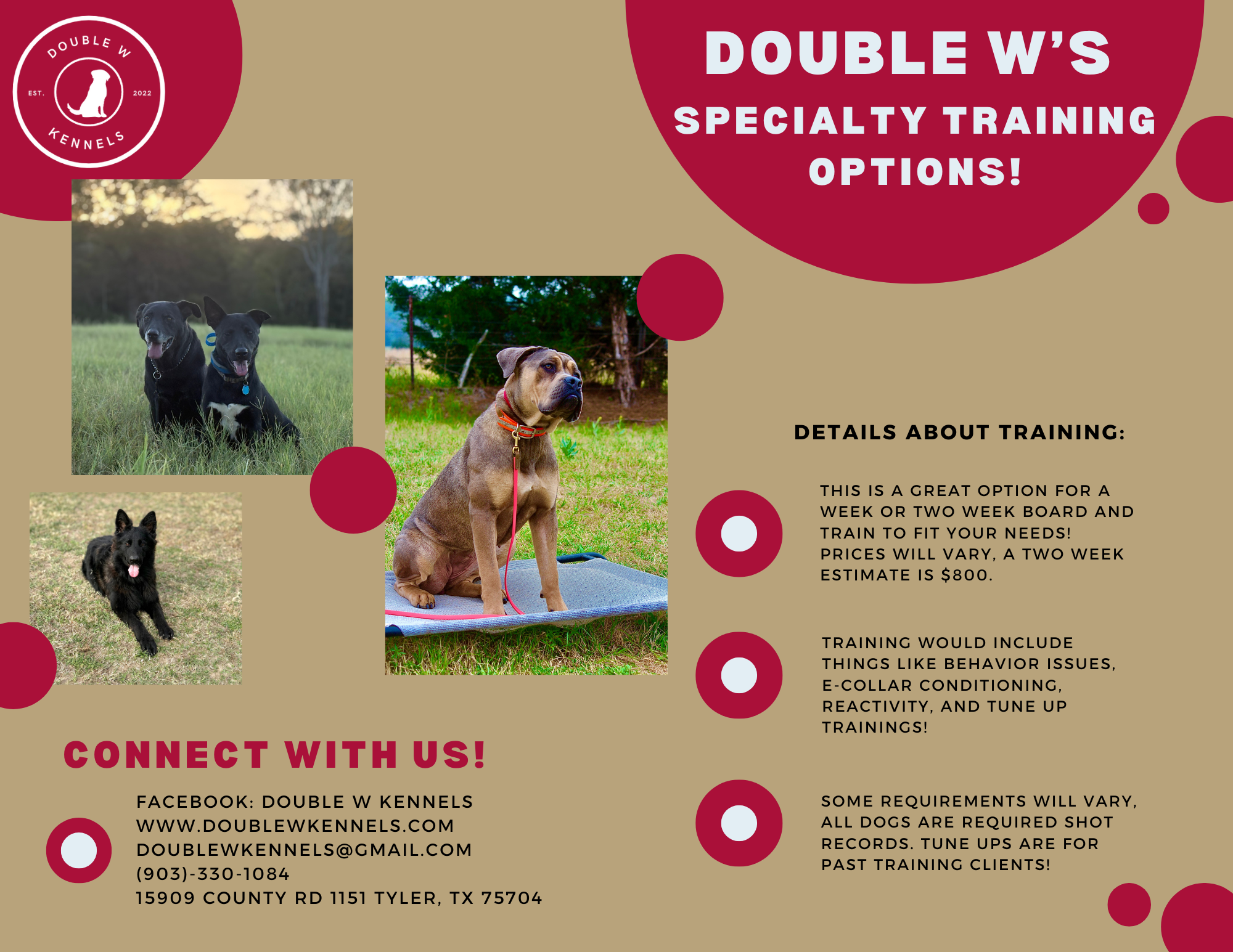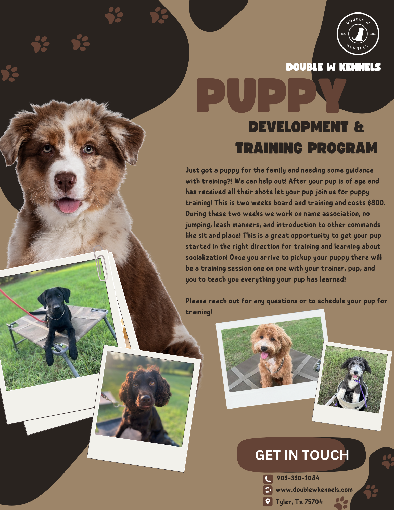 Two week board and trains are great for puppy training or specific goals for your pup. This would be a good option if you're only looking to correct reactivity or E-collar reconditioning. Please reach out if you have questions. We want to make sure your signed up for the right program to help achieve your training goals!